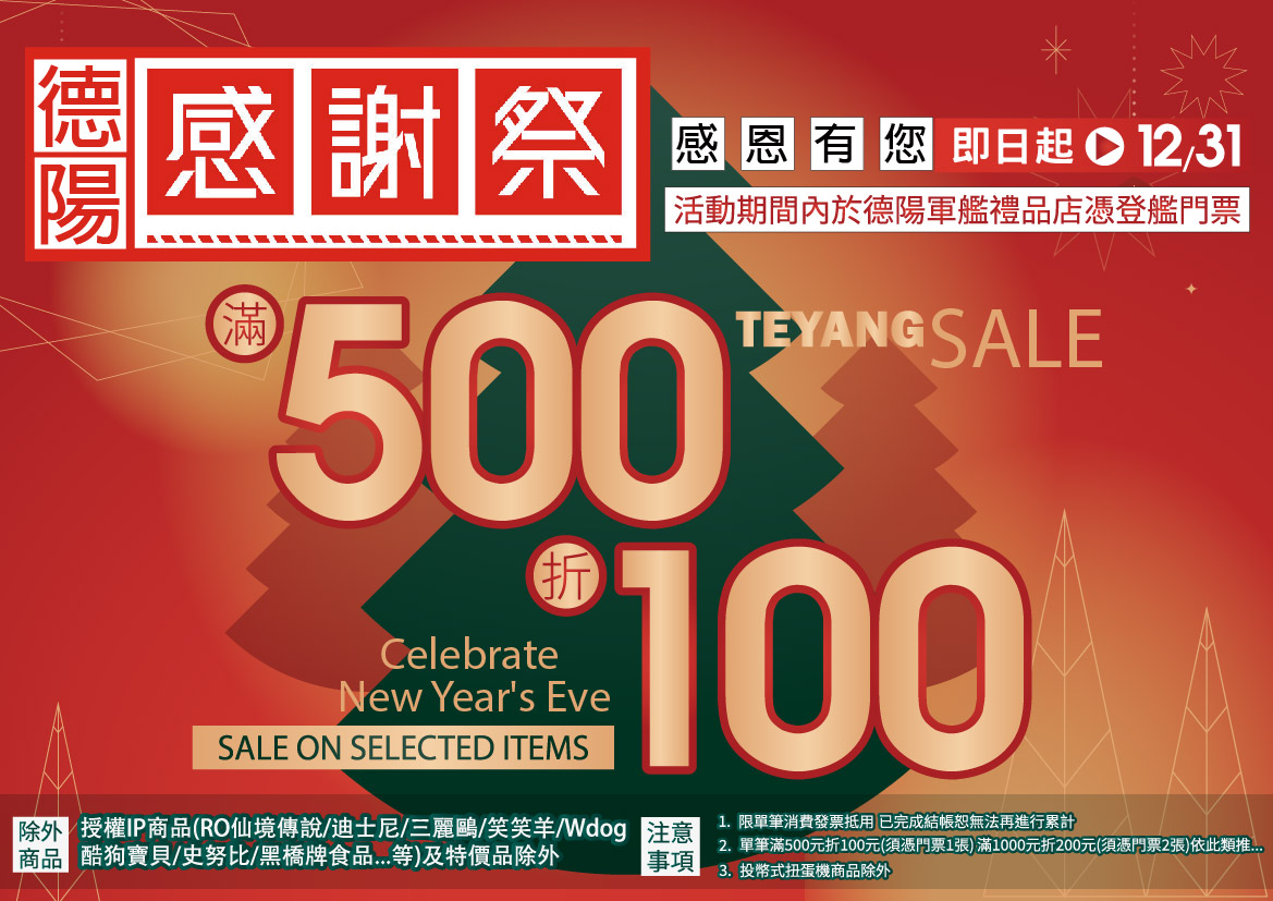🎉德陽感謝祭開跑啦! 感恩有您一路相挺~即日起至 12/31, 登艦走走、逛禮品店還能享限時優惠💥 活動期間內,於【德陽軍艦禮品店】出示登艦門票購物, 即可享滿額回饋 👉 滿500折100、滿1000折200! (部分授權商品與特價品除外)